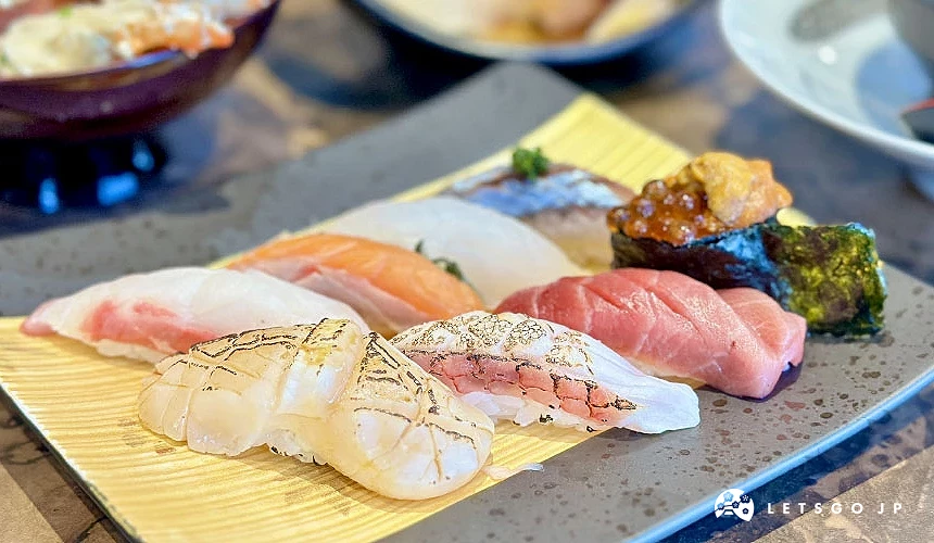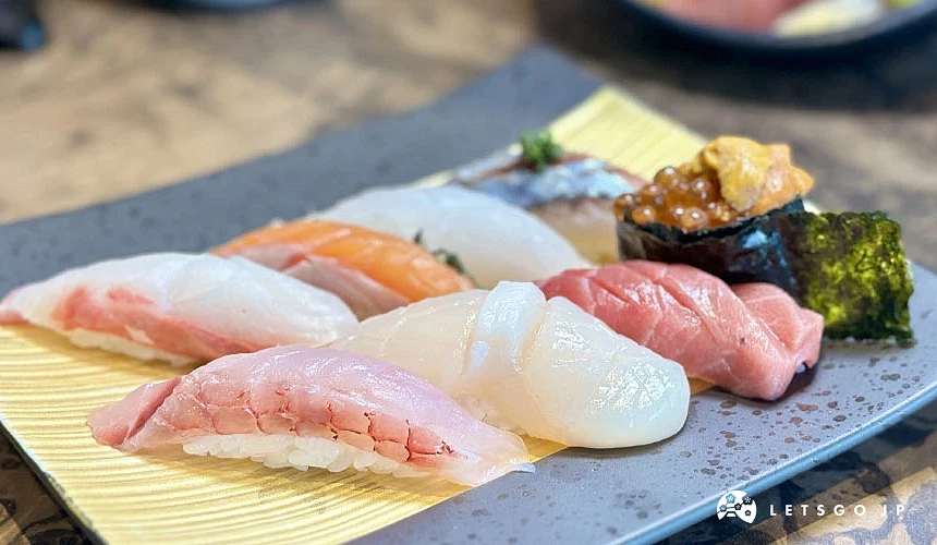 想品嚐多款魚類風味但又不想吃太多澱粉的朋友,推薦這到「生魚片拼盤(刺身盛合せ)」,能一次吃到鮪魚、長崎產生鯖魚、琉球黃鰭棘鯛等多款時令魚類(依季節有所調整)。切片厚薄恰到好處,能感受到魚肉彈性與脂質香甜,以及不同魚種所帶來的迥異風味。特別是盛盤使用了充滿日式美學的金色半月碗,典雅又不失溫度。沒想到在看似簡單的街邊壽司店,也能品出高檔料理的質感與美味!真的令人驚艷!