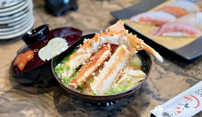 在品嚐完生魚片與壽司後,來上一碗熱騰騰的「螃蟹湯(てっぽう汁)」,做個完美收尾吧!「螃蟹湯(てっぽう汁)」是來自北海道道東地區的鄉土料理,使用味噌湯底慢火熬煮,加入新鮮螃蟹與蔬菜一同燉煮,湯頭濃郁卻不膩口,螃蟹的鮮甜也完全融入湯中,喝一口就能感受到大海的氣息在口中蔓延。蟹殼相當柔軟,能直接咬開、吸吮肉汁,份量驚人到幾乎滿出整個碗。吃完生冷的壽司料理後,喝一碗超暖胃,推薦習慣吃熱食的人必點!