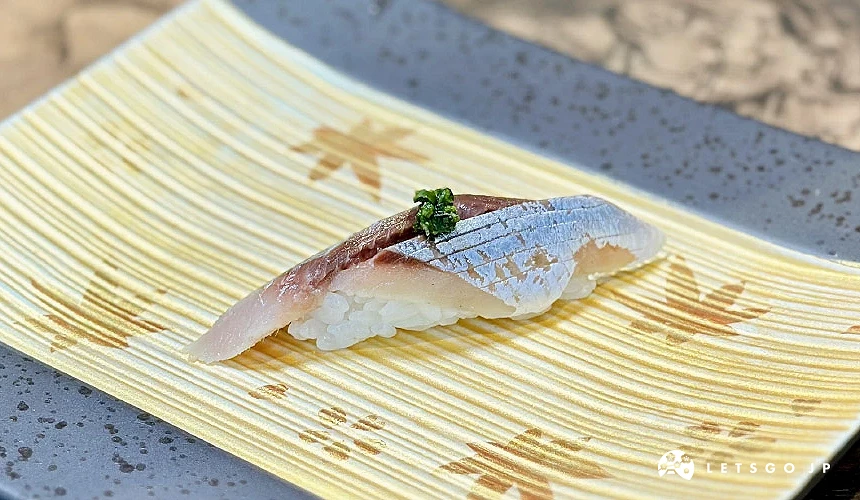 推薦必點第一道菜色就是「每日精選壽司」,一份只要69日圓非常划算!根據當日進貨狀況提供,每天都有機會品嚐不同的風味,有如開盲盒,充滿驚喜。採訪當天登場的是閃著銀光的「沙丁魚壽司(イワシ)」,油脂豐厚、香氣濃郁,入口後能感受到魚肉細緻柔軟,隨著醋飯的溫度逐漸融化,留下淡淡的鹹香尾韻。以細蔥與薑泥點綴,讓整體風味更加清爽平衡。這樣的品質與新鮮度只需銅板價就能品嚐,絕對超值!