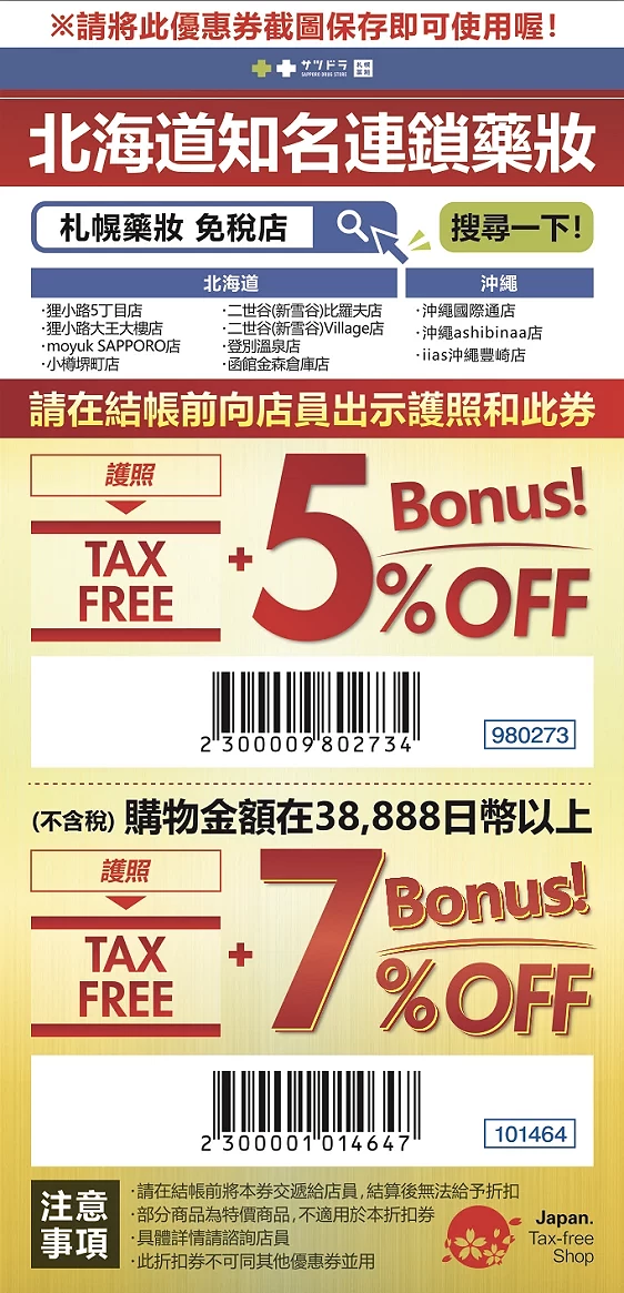 消費滿 38,888 日圓(未稅)可免稅,另外再享 7%OFF 優惠。
