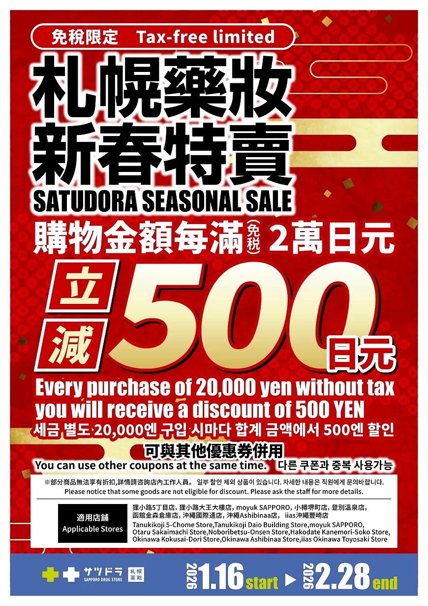 2026年1月16日起至2026年2月28日止,只要在札幌藥妝指定店鋪每消費滿2萬日元(未稅),除了免稅外,還能現折500日元。若購物滿4萬日元(未稅)則現折1,000日元;滿6萬日元(未稅)則現折1,500日元,以此類推,買越多折越多!